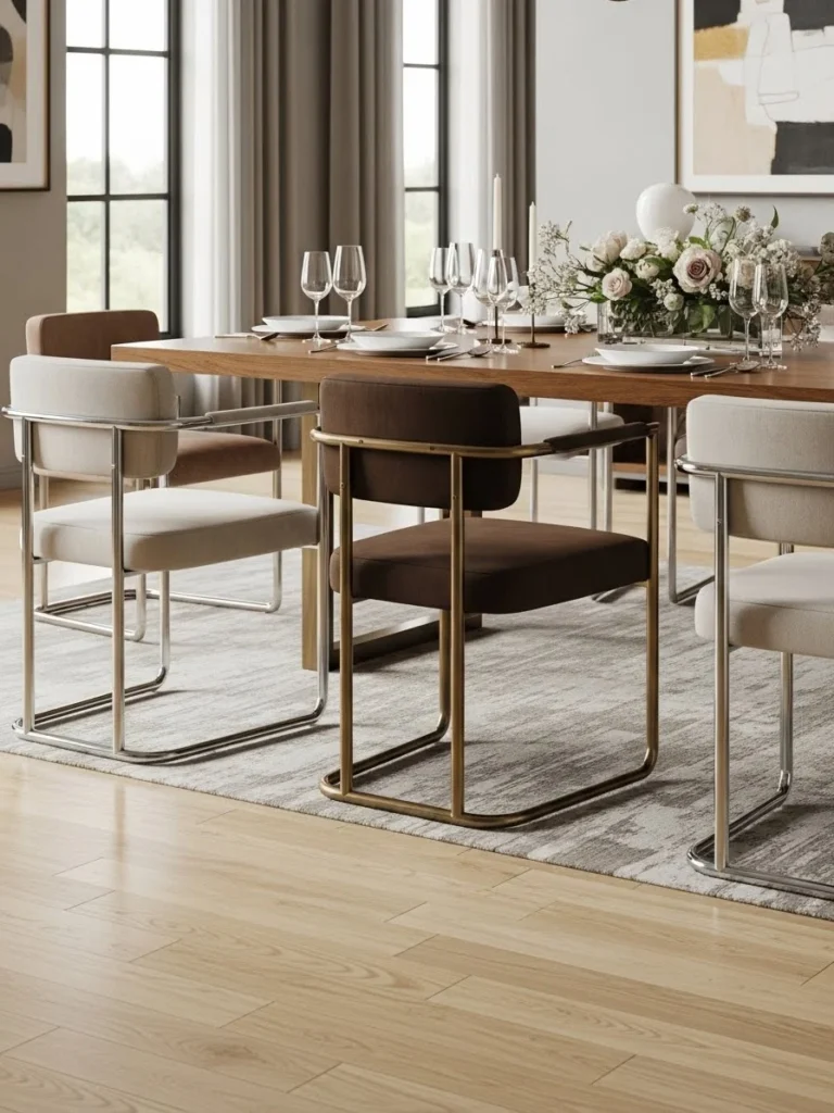 Frames may be crafted from polished metal or combined with upholstered seats in velvet, leather, or fabric. Brass adds warmth and richness, while chrome emphasizes sleekness and modernity. The contrast between metallic frames and softer upholstery creates a balanced, visually appealing aesthetic that complements diverse dining tables and décor styles.