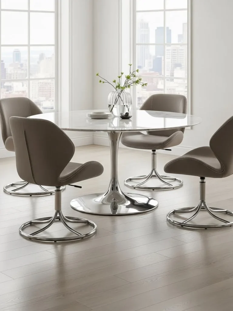 Perfect for modern entertaining, swivel dining chairs offer convenience without sacrificing design. They enhance interaction among guests while adding a unique, dynamic element to the room. Their combination of practicality, comfort, and contemporary style makes them a functional yet striking addition to any dining area.