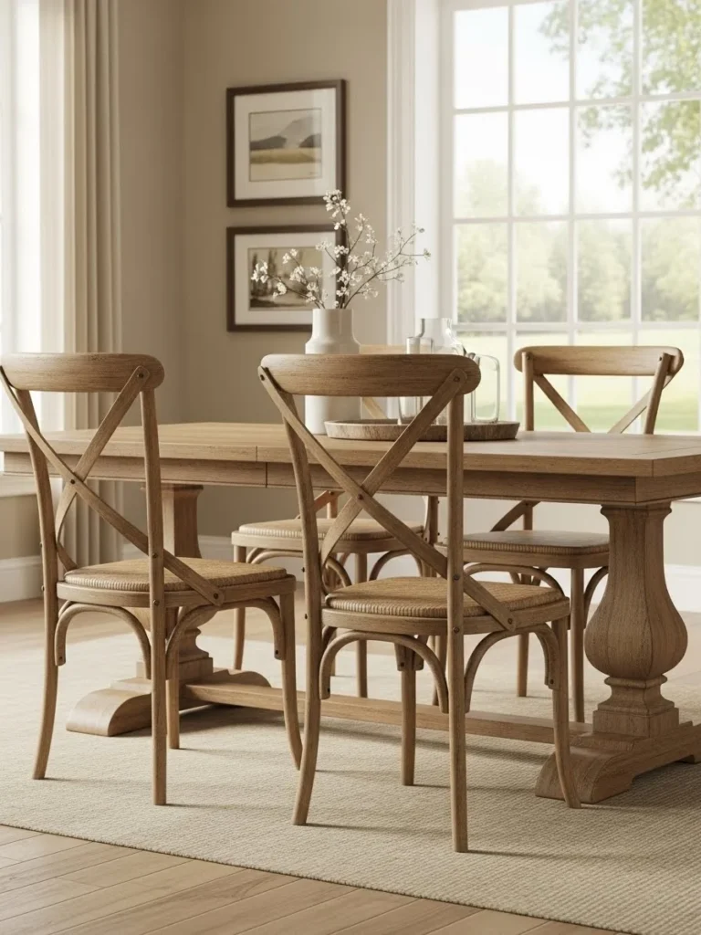 Perfect for farmhouse, country, or rustic-modern interiors, cross-back chairs create an inviting and cozy atmosphere. They balance functionality with traditional charm, transforming the dining room into a welcoming space for family meals, gatherings, and entertaining guests.