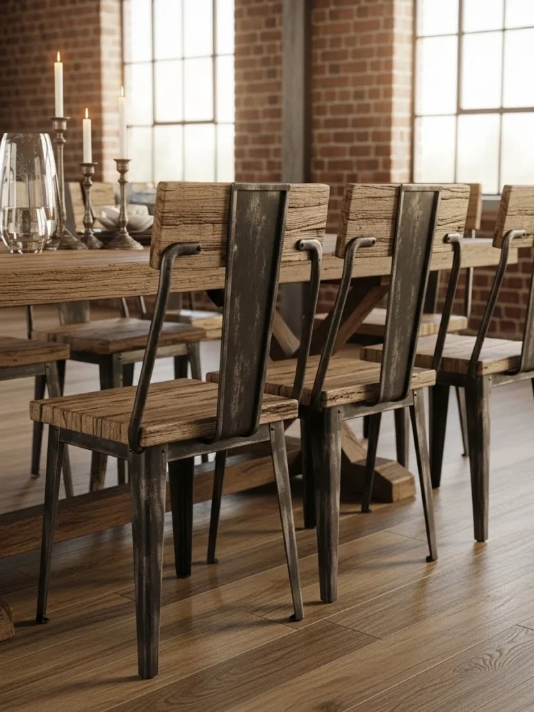 Industrial dining chairs with metal frames and rustic wood seats combine raw materials, durability, and urban sophistication. The metal framework provides structural strength and a modern edge, while the weathered or reclaimed wood seat introduces warmth and character. This juxtaposition creates a visually striking, balanced aesthetic.