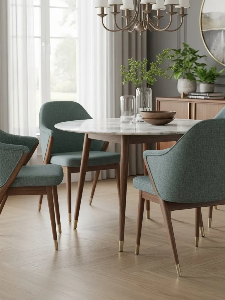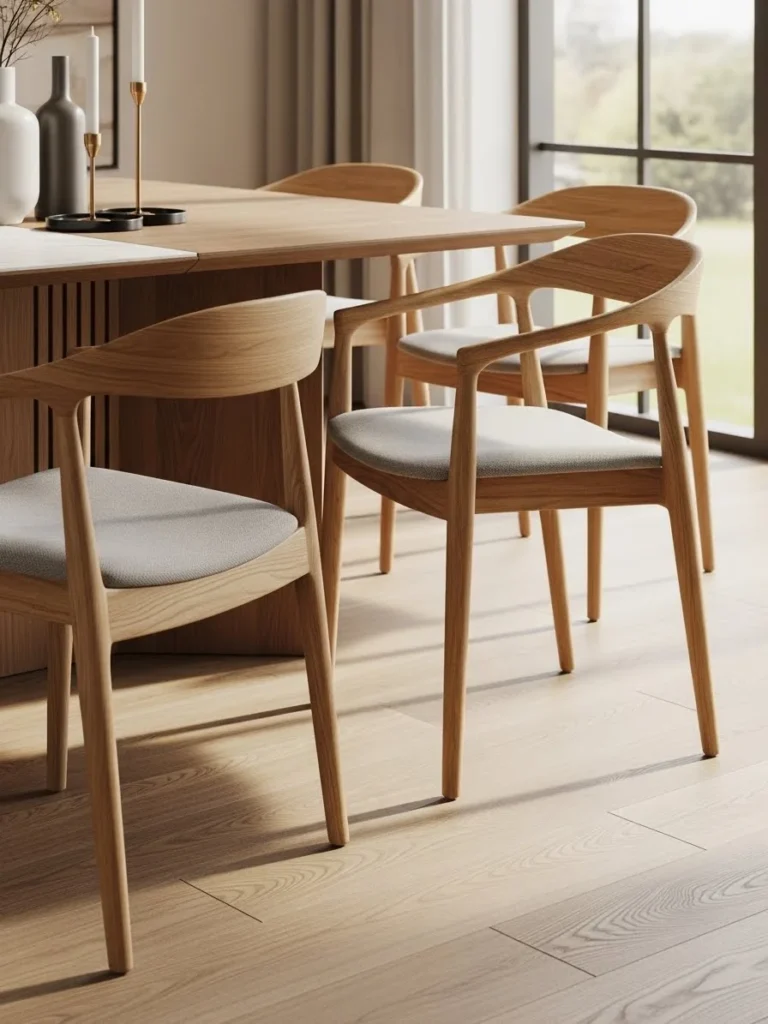 Materials vary from molded wood, upholstered fabric, or leather, paired with sturdy wooden or metal legs for durability. The ergonomic design ensures comfort without compromising aesthetic appeal, while curved lines soften the room’s overall look. Neutral tones or subtle patterns make these chairs versatile, complementing diverse table styles and interior designs.