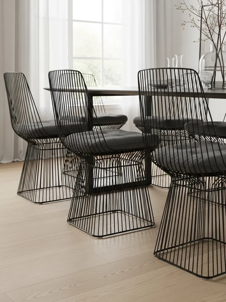 Minimalist wireframe dining chairs with chic cushions offer a perfect blend of modern design and functional comfort. The slender metal wireframe creates an airy, open aesthetic that enhances the perception of space, making them ideal for small or contemporary dining rooms. Cushions add comfort and softness while maintaining the minimalist appeal.