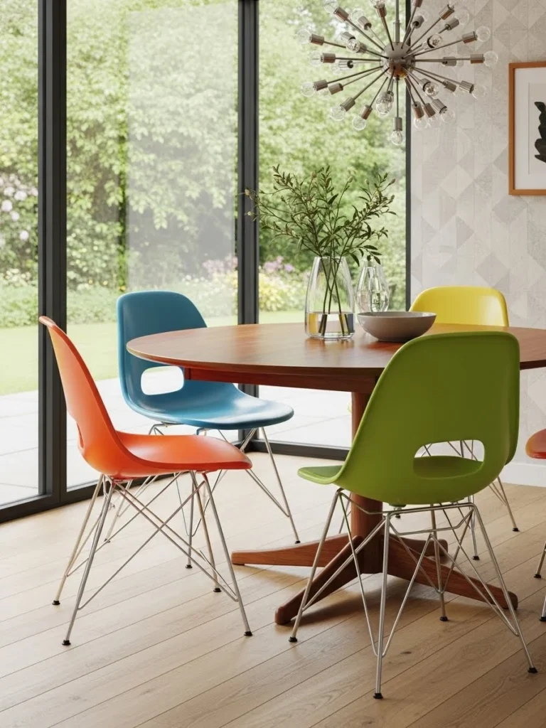 Retro dining chairs with colorful plastic shells bring vibrant energy and mid-century modern charm to the dining space. Their molded design offers ergonomic support, while bold colors like mustard, teal, red, or pastel tones inject personality and playfulness. These chairs are perfect for homeowners seeking a fun yet stylish dining environment.