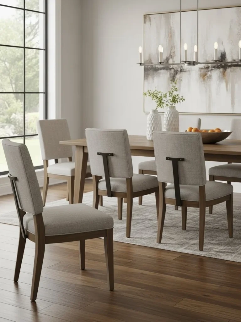 Constructed from wood, metal, or mixed materials, transitional chairs often feature upholstered seats for comfort. Neutral tones, subtle textures, and minimalist detailing allow them to integrate effortlessly with a variety of table styles, from classic wooden tables to sleek, modern surfaces.