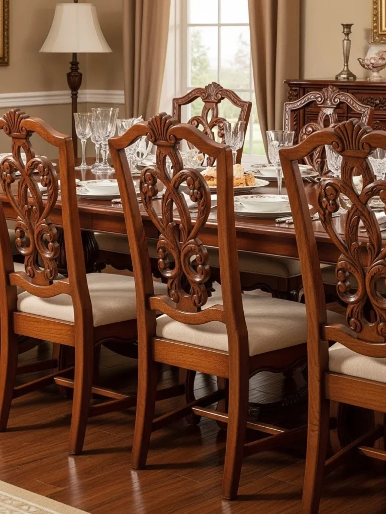 Ideal for formal, traditional, or transitional interiors, carved-back wooden dining chairs add personality, character, and refinement to the dining space. They merge craftsmanship and comfort, creating an inviting and distinguished seating option that elevates the room’s elegance and timeless appeal.