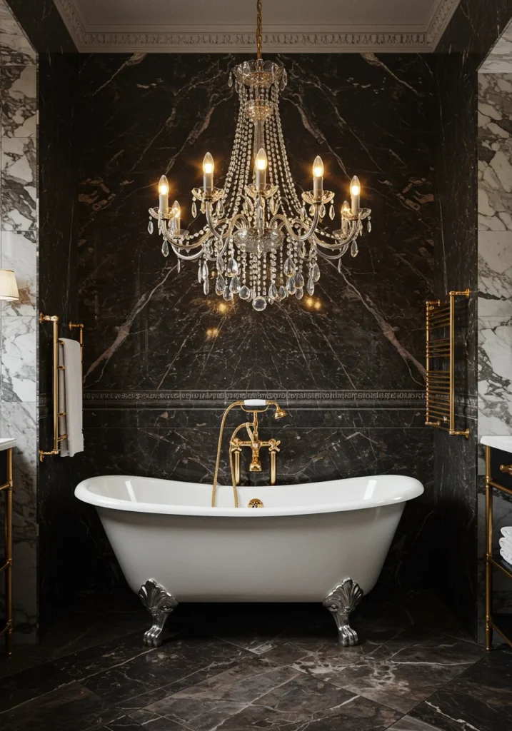 Bring vintage glamour to your fancy bathroom with an Art Deco-inspired design. Bold geometric patterns, black-and-white contrasts, and metallic finishes in gold or chrome create a timeless yet striking look. A mirrored vanity, ornate sconces, and a statement chandelier add a luxurious, dramatic touch. Glossy tiles reflect light beautifully, while marble countertops enhance the upscale vibe. Accents like a clawfoot tub, glass shelving, and stylish accessories complete the theme. This fancy bathroom blends old-world sophistication with modern luxury, making it a perfect retreat for those who appreciate elegant, statement-making interiors.
