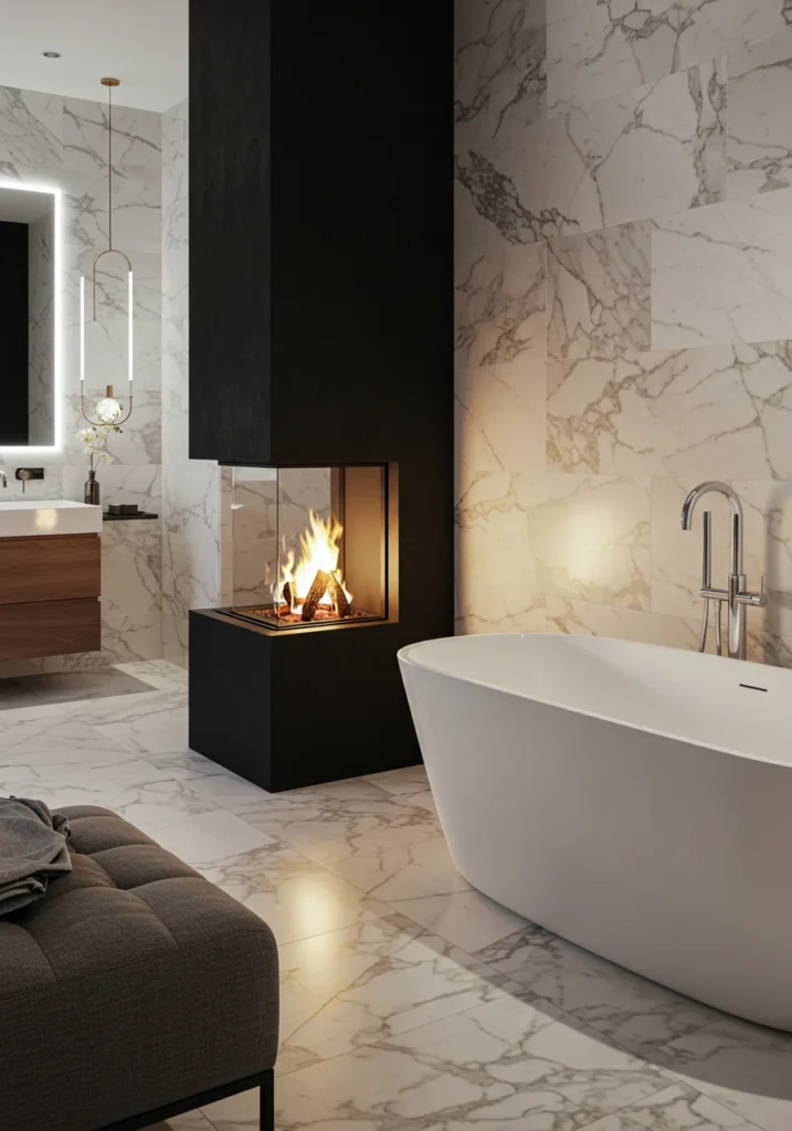 Indulge in ultimate relaxation with a fancy bathroom featuring a sleek modern fireplace beside a freestanding soaking tub. The gentle flicker of the flames creates a cozy, romantic atmosphere while you unwind. Floor-to-ceiling tiles or natural stone walls enhance the sense of luxury. Soft lighting and neutral tones make the space feel warm and welcoming. Pair the fireplace with plush rugs, heated floors, and elegant fixtures to complete the spa-like experience. This design combines contemporary elegance with comfort, creating a stunning retreat perfect for long, indulgent baths in a cozy, luxurious setting.