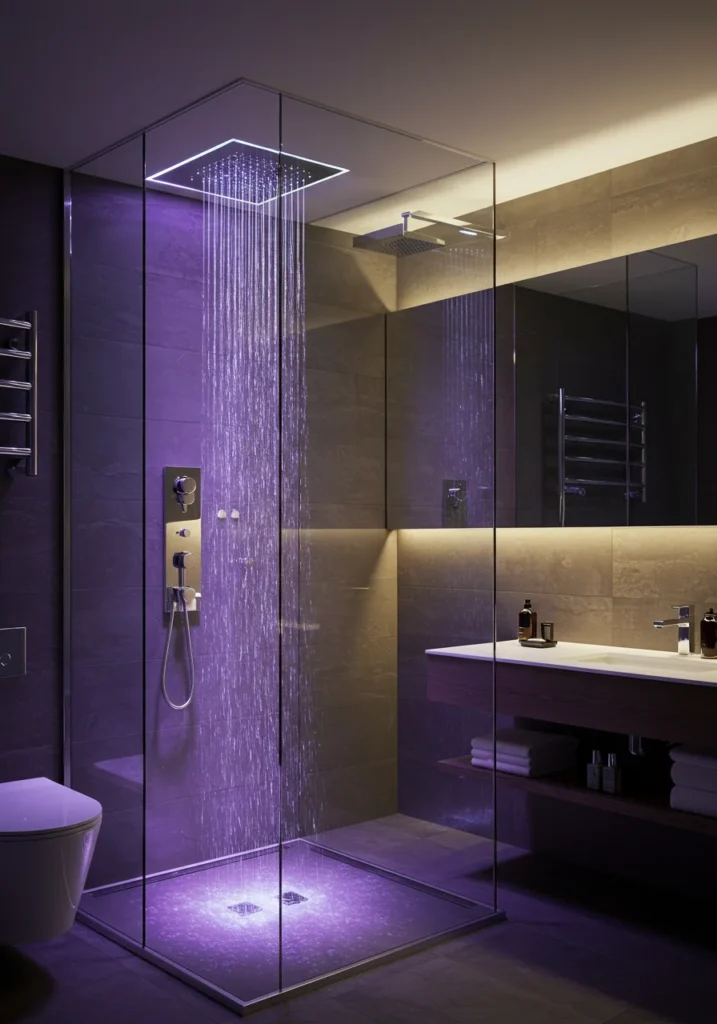 Fancy bathroom featuring a rainfall shower with glass enclosures and LED lights