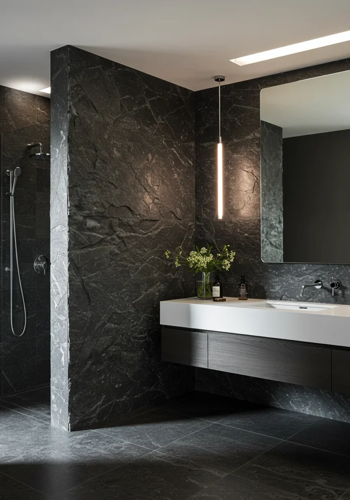Create a striking focal point with a textured stone accent wall behind the vanity in your fancy bathroom. The natural, raw texture adds depth and a luxurious spa-like feel, contrasting beautifully with sleek modern fixtures. Pair it with a floating vanity in warm wood or marble for a balanced look. Soft backlighting along the wall highlights the stone’s beauty, creating a calming ambiance. Neutral floor tiles and minimalist storage keep the focus on the statement wall. This design merges nature-inspired materials with elegant finishes, resulting in a chic, upscale bathroom that feels both warm and contemporary.