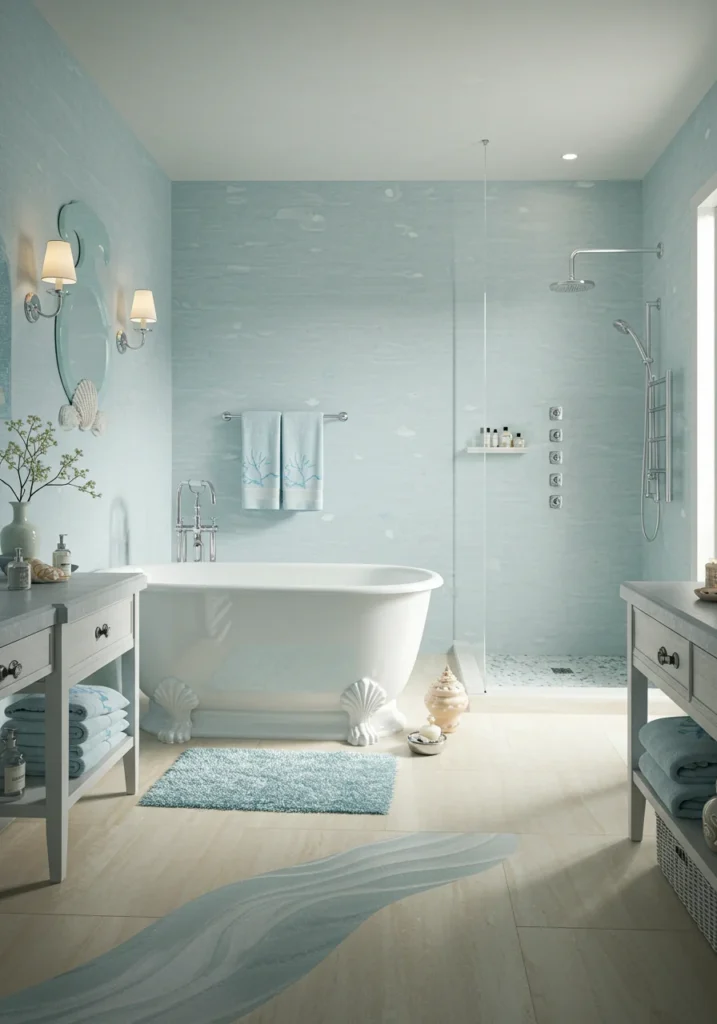Fancy bathroom in a coastal style with soft blue tones and seashell decor