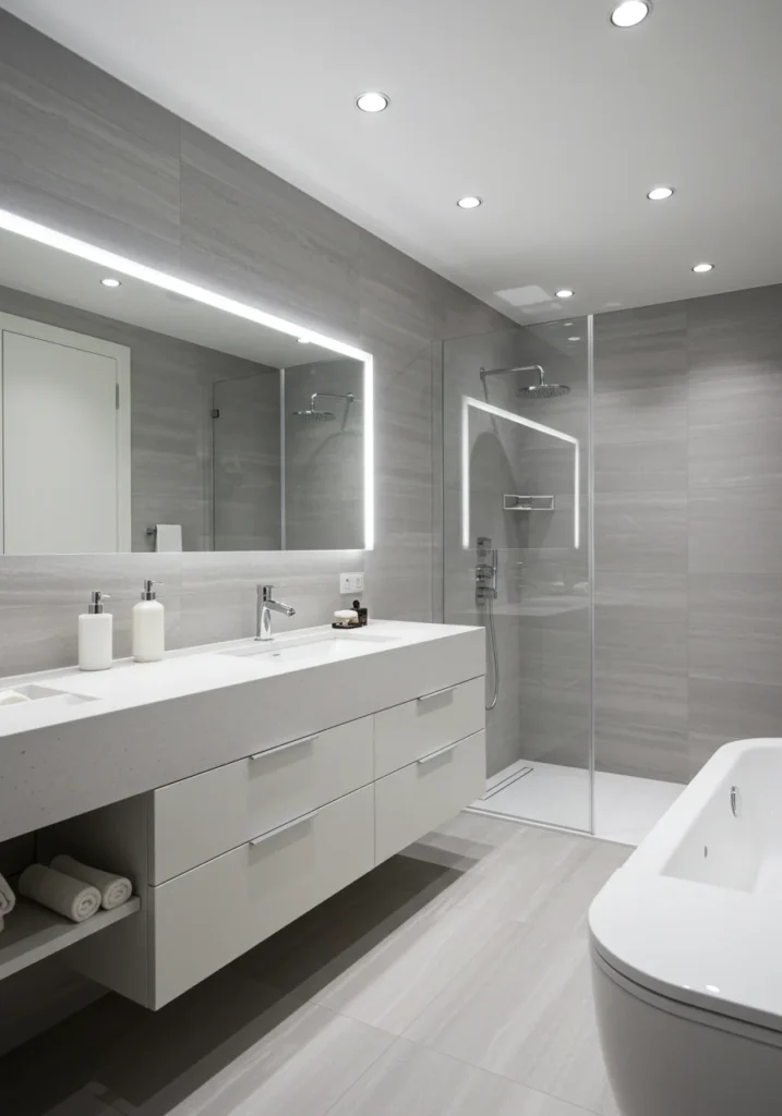 Fancy bathroom in a minimalist style with hidden storage and clean lines