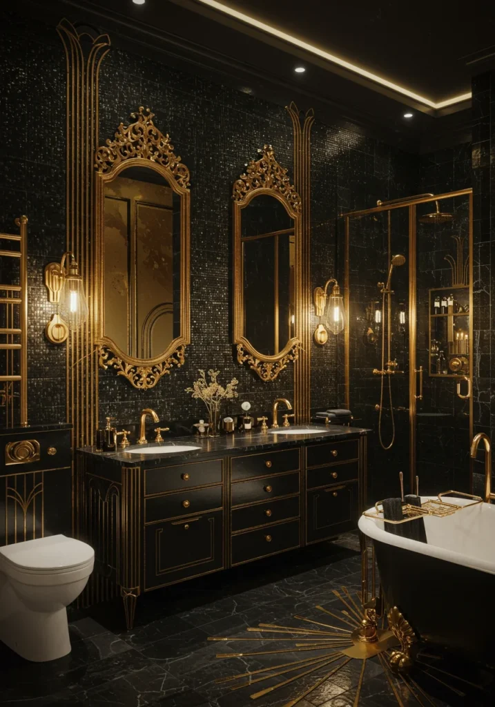 Fancy bathroom in an Art Deco theme with metallic finishes and mirrors