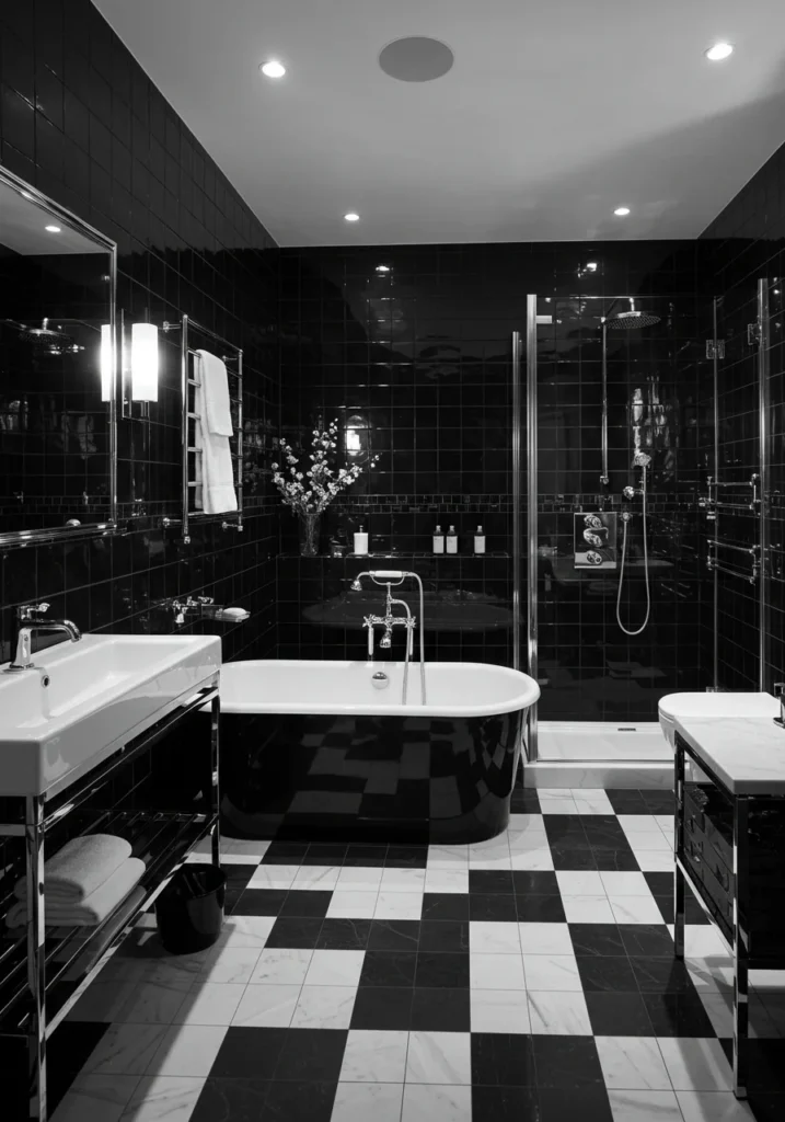 Fancy bathroom in black and white with high-gloss tiles and sleek finishes