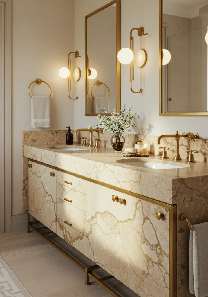 Fancy bathroom with a double vanity in natural stone and brass accents
