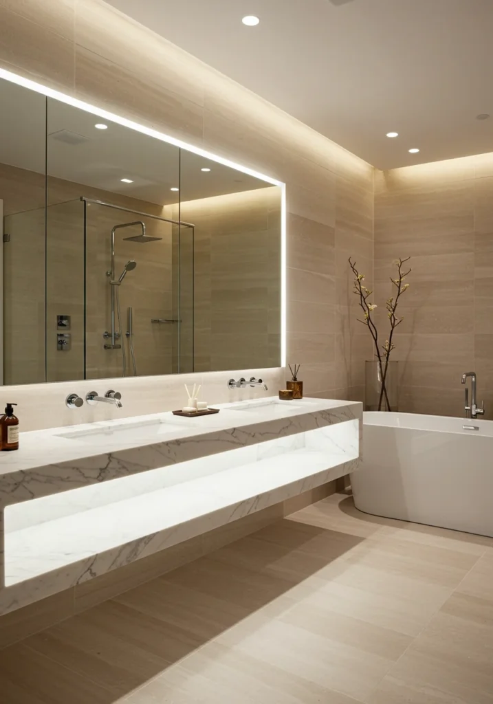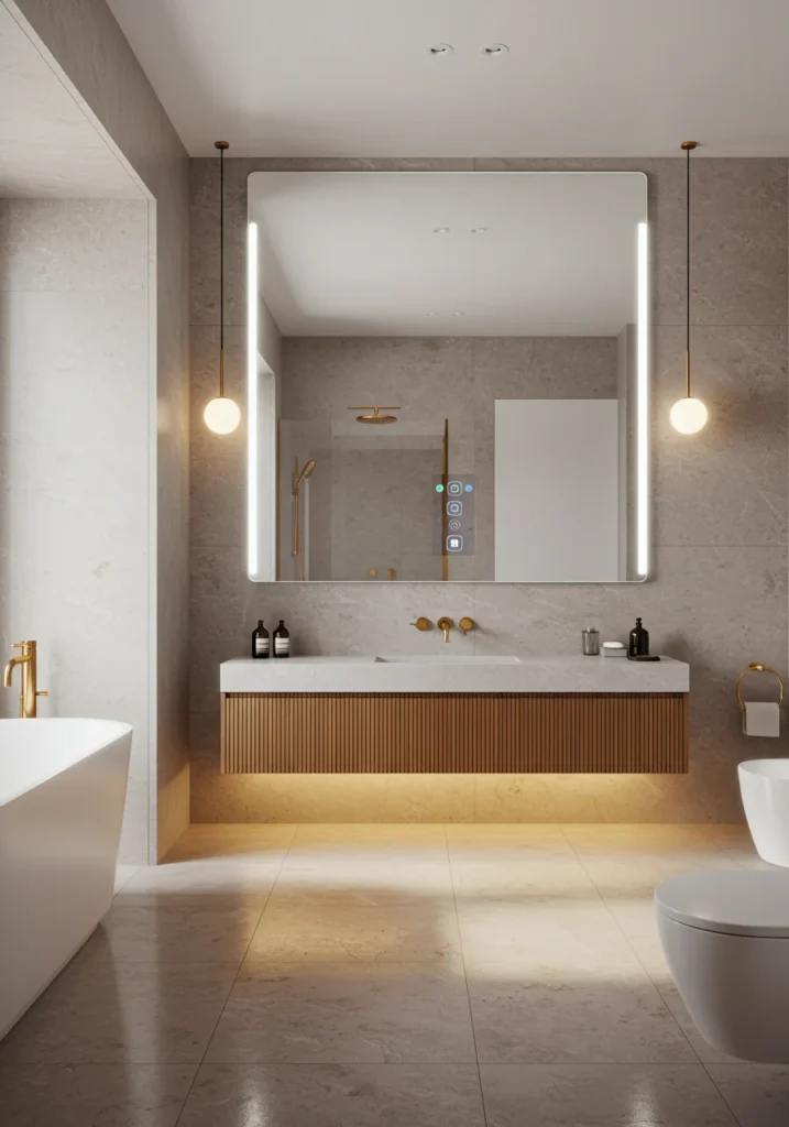 Step into a bathroom that merges high-end design with cutting-edge technology. Heated floors keep the space cozy, while a smart mirror with built-in lighting, defogging, and touch controls adds ultimate convenience. Sleek cabinetry keeps clutter hidden, maintaining a minimalist yet luxurious look. Large-format tiles and soft neutral tones create a soothing atmosphere, while subtle LED strip lighting enhances the modern feel. Pair this with a freestanding tub or a frameless glass shower for a complete spa-like retreat. This fancy bathroom design balances comfort, innovation, and sophistication for the ultimate daily upgrade.