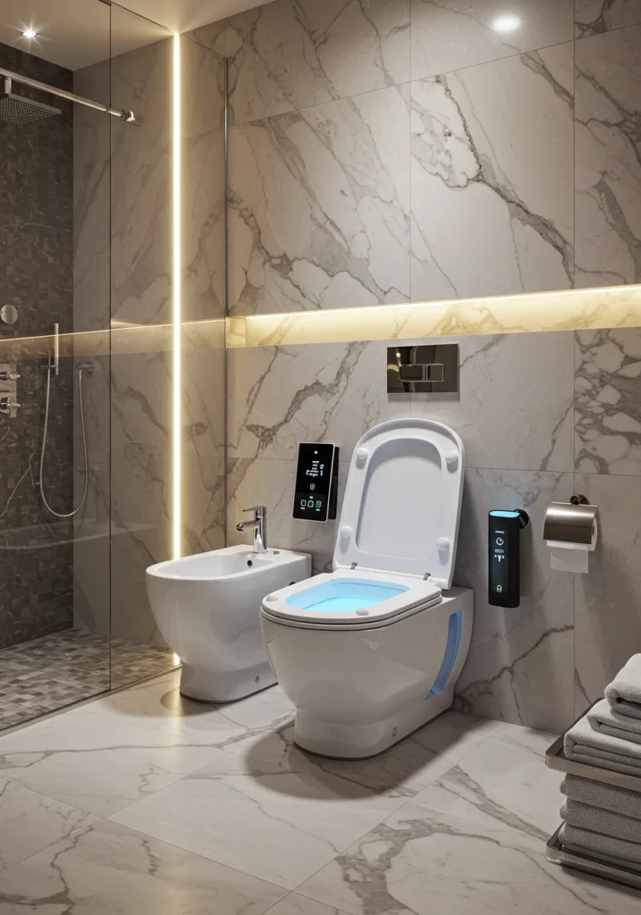 Fancy bathroom with a luxurious bidet and high-tech toilet features