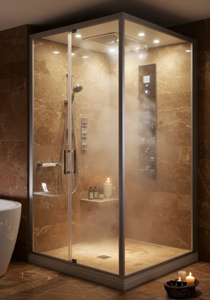 Fancy bathroom with a luxurious spa-like steam shower and aromatherapy