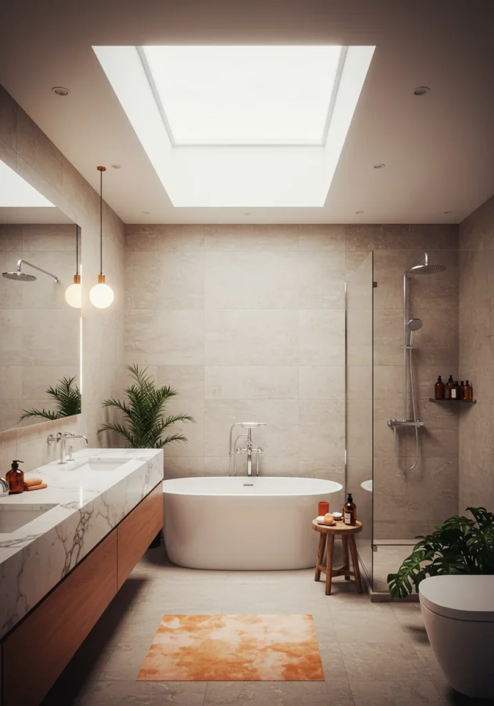 Imagine soaking in a bathtub beneath a beautiful skylight that floods the bathroom with natural light. This fancy design creates an open, airy ambiance while maintaining privacy. Soft neutral tones and natural stone tiles complement the bright space, making it feel calm and inviting. A freestanding tub or walk-in shower beneath the skylight becomes the room’s focal point. Minimalist fixtures and floating vanities keep the design sleek and uncluttered. At night, the skylight reveals a view of the stars, turning every bath into a serene, luxurious experience. Perfect for bringing nature’s light indoors in style.