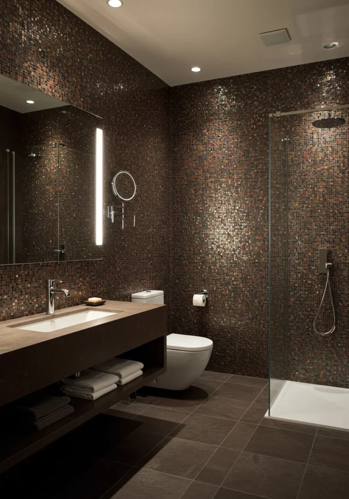 Fancy bathroom with a statement wall of mosaic tiles and ambient lighting