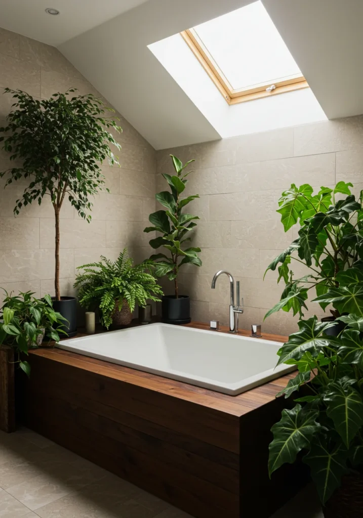 Create a tranquil spa-like oasis with a sunken bathtub framed by lush indoor greenery. The lowered tub gives the space a unique, architectural feel while plants add a natural, calming atmosphere. Warm-toned wood and stone textures enhance the earthy aesthetic, while soft ambient lighting highlights the serene vibe. A skylight or large window brings in natural light, making the plants thrive. Minimalist fixtures keep the focus on the bathtub’s design and surrounding greenery. This fancy bathroom combines wellness and style, offering a peaceful escape that feels like bathing in a luxurious indoor garden retreat.