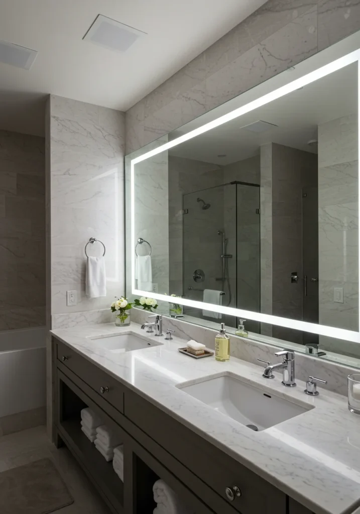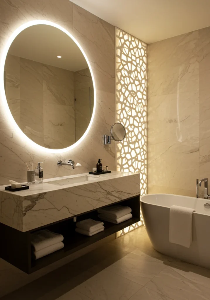 Make a bold statement with an oversized round mirror that becomes the focal point of your fancy bathroom. Backlighting behind the mirror adds soft illumination, creating a warm, ambient glow. Pair this with a sleek floating vanity and modern vessel sinks for a chic, contemporary vibe. Neutral tones like soft beige, white, or gray enhance the minimalist look, while subtle metallic accents add a touch of glamour. A frameless glass shower or freestanding tub complements the space, keeping the design open and elegant. This bathroom feels both trendy and timeless, offering a stylish daily retreat.