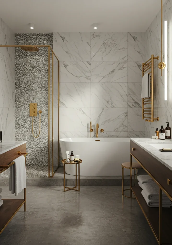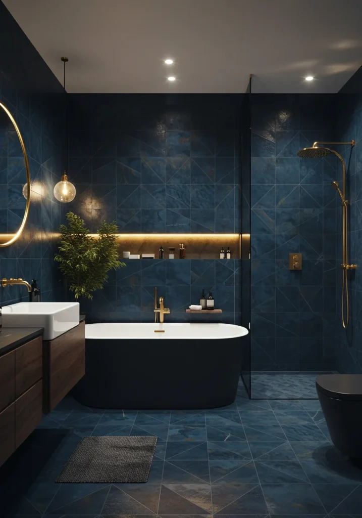 Turn your bathroom into a showstopper with metallic gold tiles that add instant glamour. Use them as a feature wall behind the vanity or bathtub to create a luxurious focal point. Pair with marble flooring and sleek fixtures in matte black or polished chrome for contrast. Soft, warm lighting enhances the golden shimmer, making the space glow with elegance. Minimalist accessories and neutral tones elsewhere keep the look balanced. This fancy bathroom design exudes opulence, making it perfect for those who want a bold, high-end statement space with a touch of drama and sophistication.