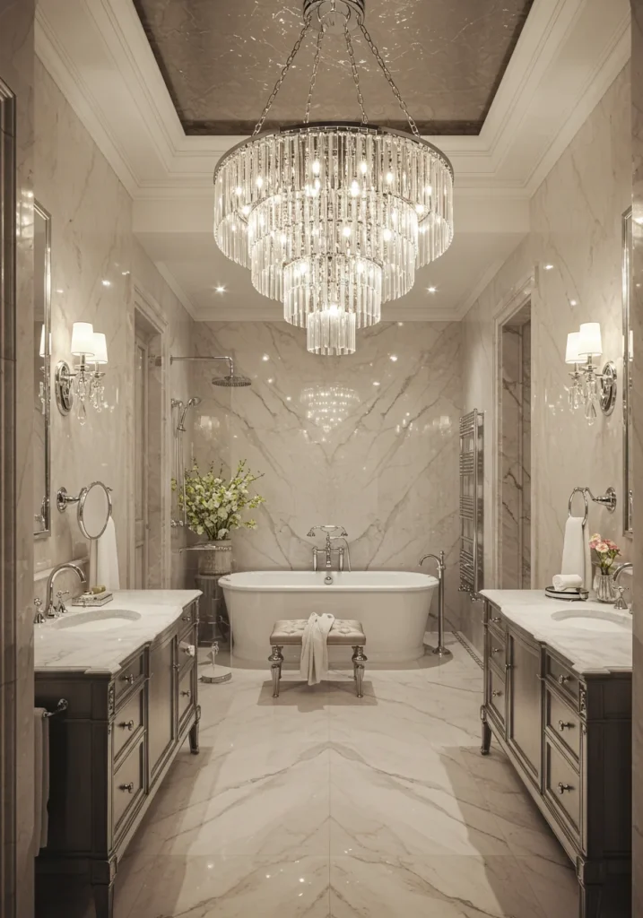 Bring glamour into your bathroom with sparkling crystal pendant lighting that adds elegance and drama. Polished chrome fixtures and accessories reflect light beautifully, enhancing the luxurious feel. A freestanding tub beneath the pendant lights becomes a stunning focal point, while glossy tiles or marble surfaces add depth and texture. A large frameless mirror and subtle under-cabinet lighting create a bright, airy ambiance. Soft, neutral tones keep the look sophisticated without overwhelming the space. This fancy bathroom design exudes high-end hotel vibes, making it the perfect retreat for those who love classic elegance with a modern twist.