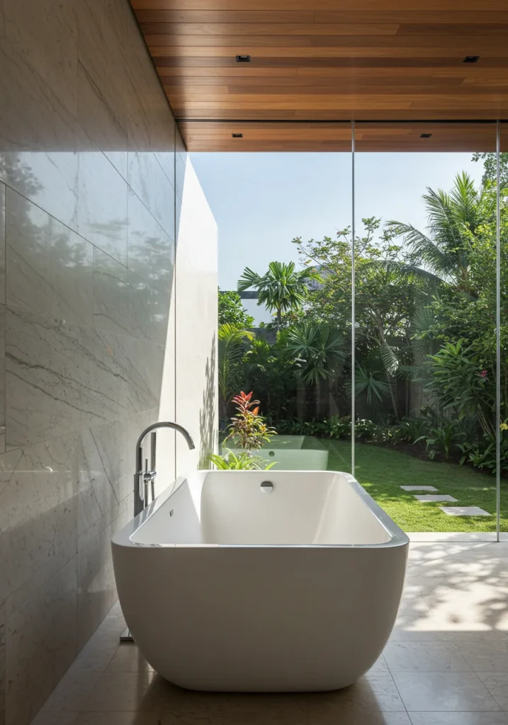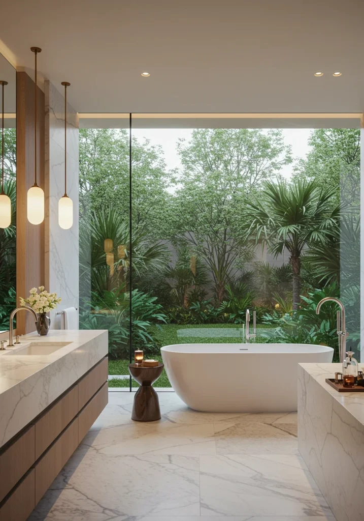 Fancy bathroom with floor-to-ceiling windows overlooking a serene garden