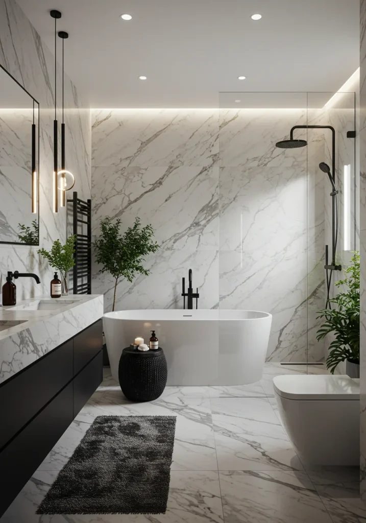 Elevate a classic marble bathroom with the sleek sophistication of matte black fixtures. The natural veining of marble countertops brings timeless elegance, while black faucets, showerheads, and handles add a bold modern contrast. A frameless glass shower with marble walls and a freestanding tub complement the look. Subtle lighting under the vanity or mirrors adds warmth, balancing the monochrome palette. Decorative accents like black-framed mirrors or minimalist storage keep the space stylish yet functional. This fancy bathroom blends traditional luxury with contemporary edge, creating a stunningly chic, high-end retreat for everyday indulgence.