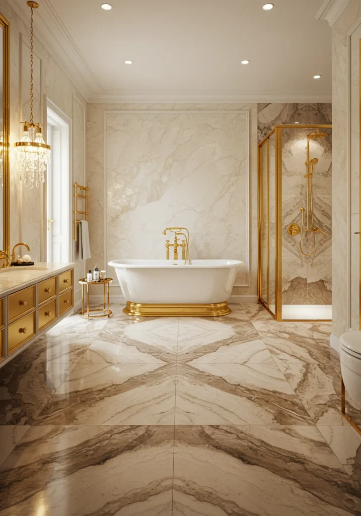Step into pure luxury with a bathroom designed for ultimate sophistication. Gleaming marble floors add timeless elegance, while gold fixtures provide a touch of opulence that elevates the entire space. The centerpiece is a stunning freestanding soaking tub, perfect for unwinding after a long day. Soft ambient lighting reflects beautifully off the marble, creating a serene, spa-like atmosphere. Minimalist storage solutions keep the area clutter-free, allowing the luxurious finishes to take center stage. Pair with plush white towels, fresh greenery, and a crystal chandelier to complete this glamorous yet serene fancy bathroom retreat.
