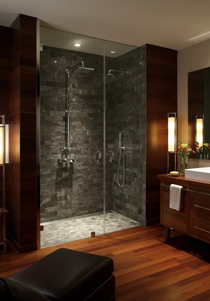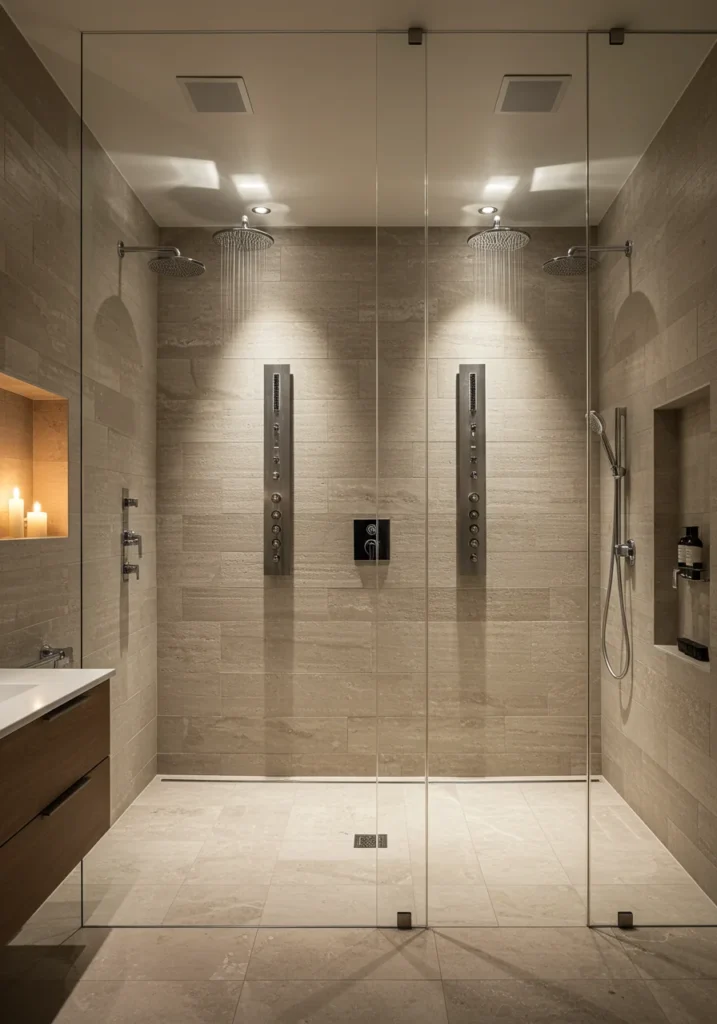 Indulge in spa-like luxury with a double shower that combines rainfall showerheads and body jets for a fully immersive experience. Frameless glass enclosures keep the design open and modern, while marble or textured stone tiles add elegance. Built-in niches with soft lighting keep essentials organized and stylishly displayed. Pair the shower with a sleek double vanity, underfloor heating, and ambient lighting for the ultimate relaxation. This fancy bathroom is perfect for couples or anyone who loves a high-end, rejuvenating shower experience, blending technology, comfort, and sophisticated design in one space.