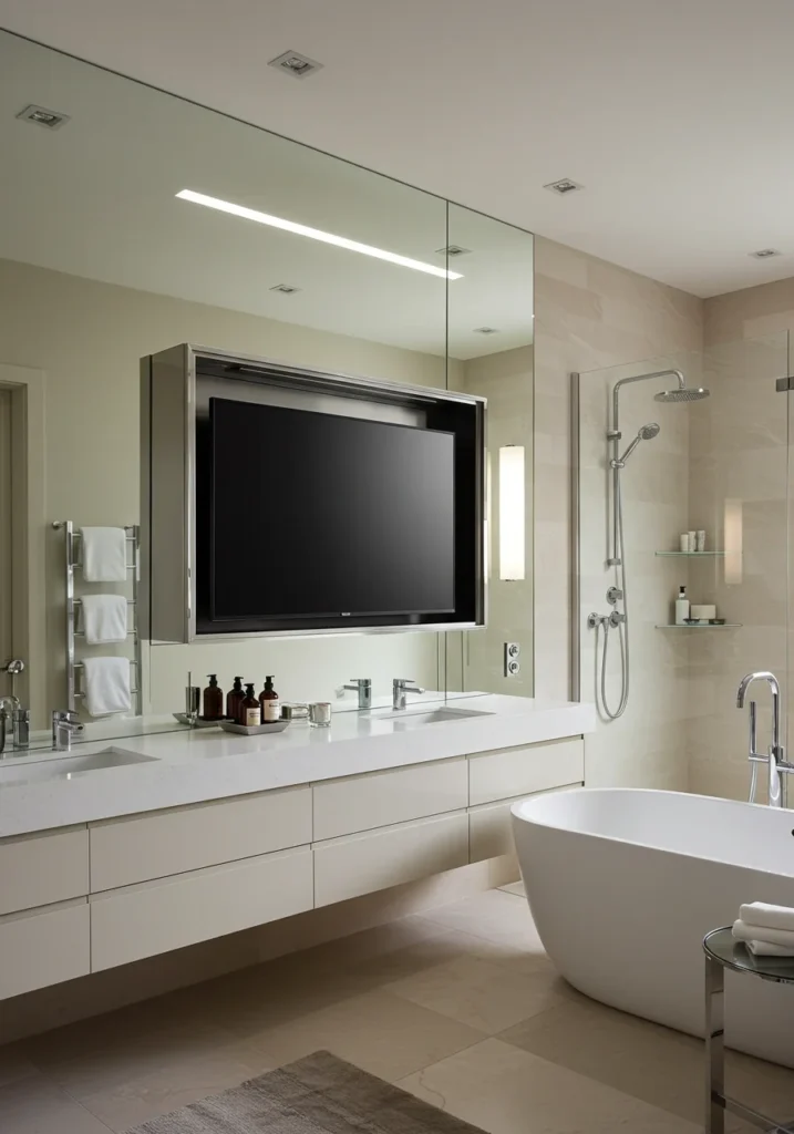 Combine technology and style with a fancy bathroom featuring a hidden TV screen seamlessly integrated into the vanity mirror. This innovative design keeps the space sleek and clutter-free while offering entertainment as you get ready or soak in the tub. Pair this high-tech feature with modern finishes like marble countertops, frameless mirrors, and LED lighting for a luxurious, hotel-inspired feel. A glass-enclosed shower or freestanding bathtub adds to the spa-like experience. This bathroom perfectly blends functionality, innovation, and high-end design, making it ideal for those who enjoy smart luxury and cutting-edge style.