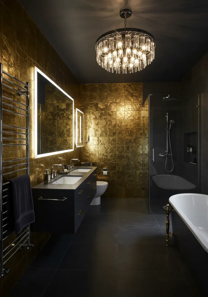 Fancy bathroom featuring metallic gold tiles for a glamorous effect