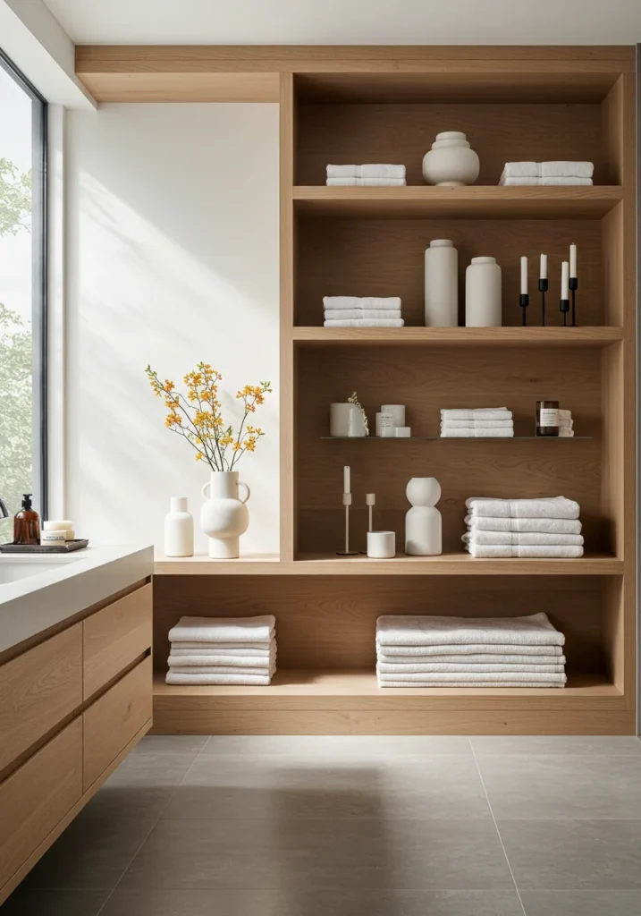Fancy bathroom featuring open shelving with neatly arranged decor pieces