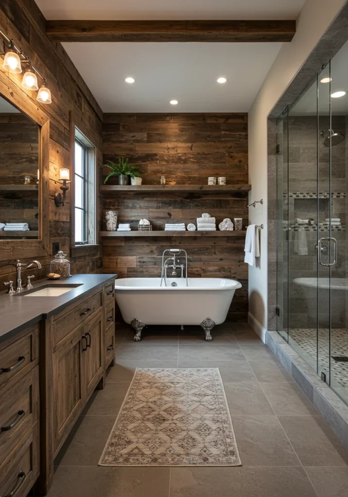 Fancy bathroom in a rustic chic style with reclaimed wood accents