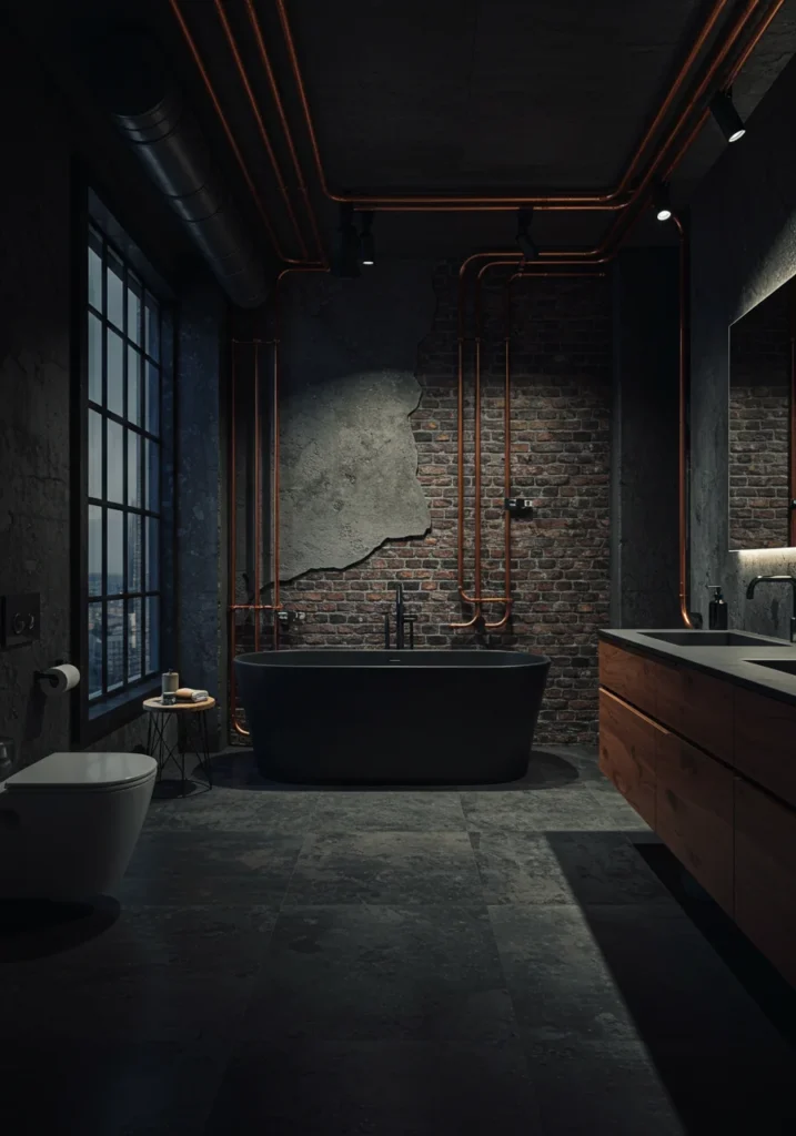 Bring an urban edge to your bathroom with an industrial-inspired design. Exposed pipes, concrete walls, and matte black fixtures create a raw, contemporary look. Pair these elements with a sleek glass shower enclosure and a floating vanity in reclaimed wood for warmth. Edison bulb lighting and metal-framed mirrors enhance the industrial vibe. Add textured rugs or soft towels to balance the rugged finishes with comfort. This fancy bathroom design is perfect for those who love a bold, modern aesthetic that feels both edgy and sophisticated, blending industrial charm with high-end touches.