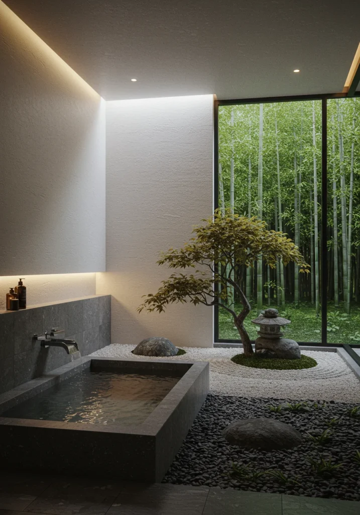 Bring peace and balance to your bathroom with a Japanese soaking tub as the centerpiece. Compact yet deep, it offers a calming retreat, surrounded by natural materials like stone and wood. Soft neutral tones and clean lines create a minimalist Zen-inspired vibe. A small indoor garden or bonsai adds a touch of nature, while dimmable lighting sets a tranquil ambiance. Sliding wooden doors or screens enhance the authentic feel. This fancy bathroom focuses on wellness, simplicity, and natural beauty, creating a serene sanctuary that blends traditional Japanese design with modern elegance.