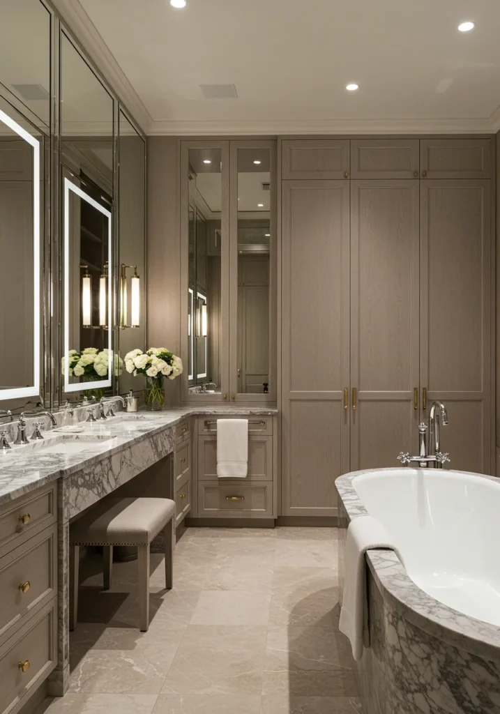 Turn your bathroom into a true personal suite with a connected luxe dressing area. A spacious vanity with ample storage flows seamlessly into a dressing nook complete with a plush bench, full-length mirror, and elegant lighting. Marble countertops, high-end cabinetry, and soft rugs elevate the luxurious feel. Add stylish storage for accessories and beauty essentials to keep the area organized. Neutral tones with metallic accents make the space feel polished and sophisticated. This fancy bathroom design combines practicality and indulgence, creating a multifunctional retreat that feels like a private high-end dressing room.