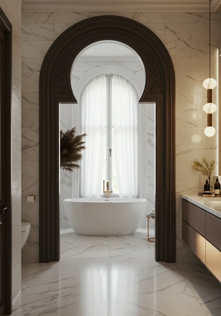 Add a touch of architectural elegance to your bathroom with a graceful archway that frames the bathtub area. This design creates a soft, romantic transition within the space, making the tub feel like a luxurious focal point. Pair the archway with mosaic tiles, soft lighting, and neutral tones for a timeless look. A freestanding tub beneath a chandelier enhances the sophisticated vibe, while minimalist storage keeps the area uncluttered. This fancy bathroom design combines classic architectural details with modern luxury, creating a serene retreat that feels both elegant and inviting.