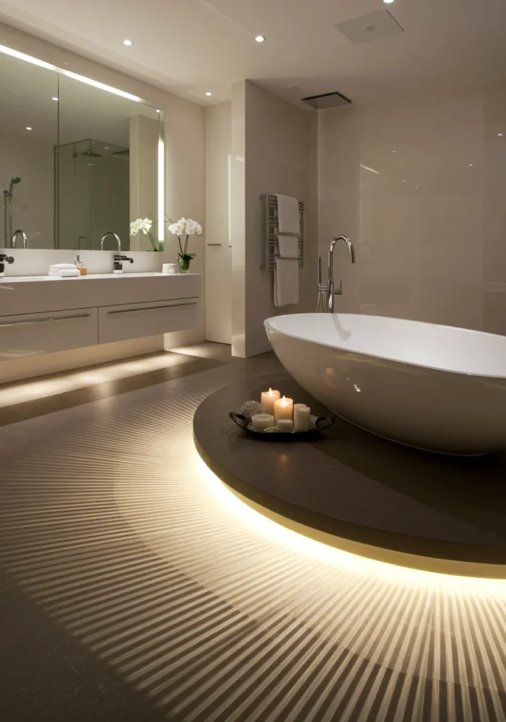 Make a bold statement with dramatic floor lighting that highlights a stunning sculptural bathtub as the centerpiece of your fancy bathroom. Recessed LED strips along the floor edges create a soft, glowing effect, adding depth and ambiance. The unique shape of the bathtub becomes an art piece in itself, paired with minimalist fixtures for a sleek, contemporary look. Large-format tiles and neutral tones keep the focus on the lighting and tub design. This high-impact, modern bathroom combines function and artistry, offering a sophisticated space that feels both luxurious and visually captivating.