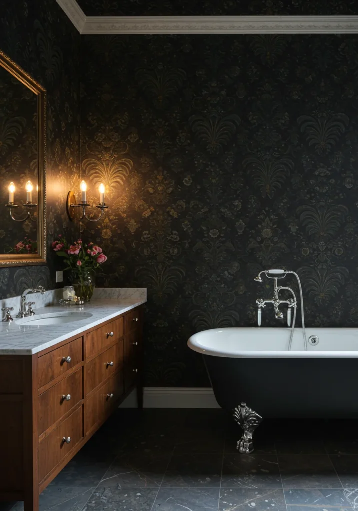 Fancy bathroom with unique patterned wallpaper and designer sconces