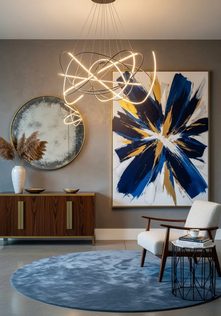 Artistic Entryway with Statement Wall Art and Sculptural Lighting