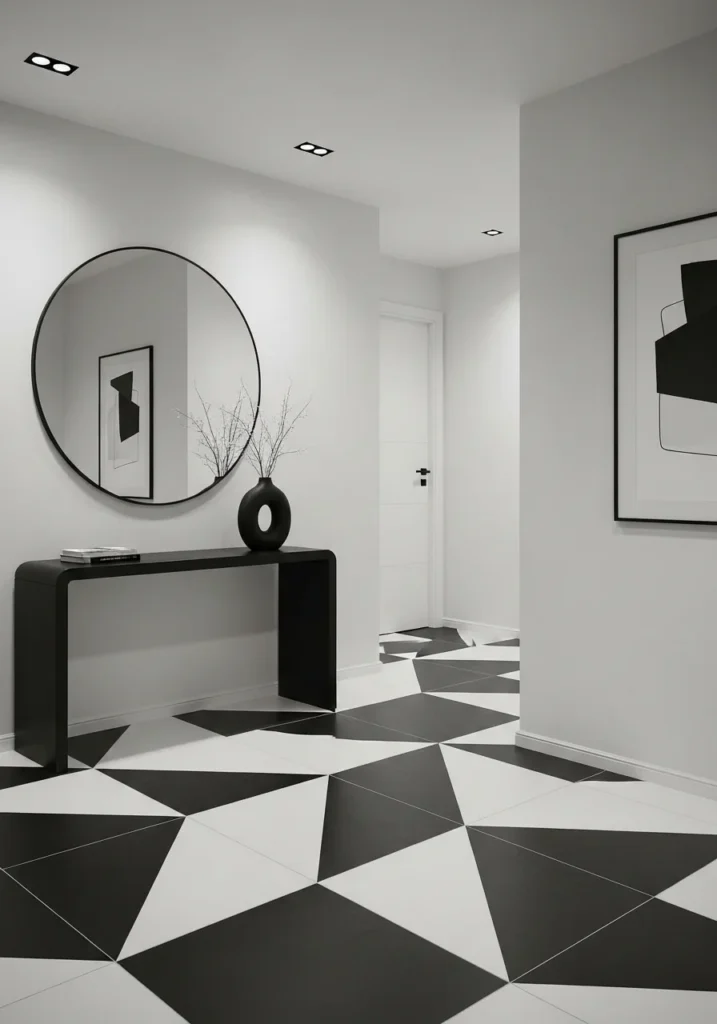 These graphic patterns add energy and dimension, guiding the eye through the entryway. When paired with white walls, matte black accents, and minimalist decor, the result is a clean yet captivating aesthetic. Sleek furniture and monochrome artwork further enhance the contemporary vibe.