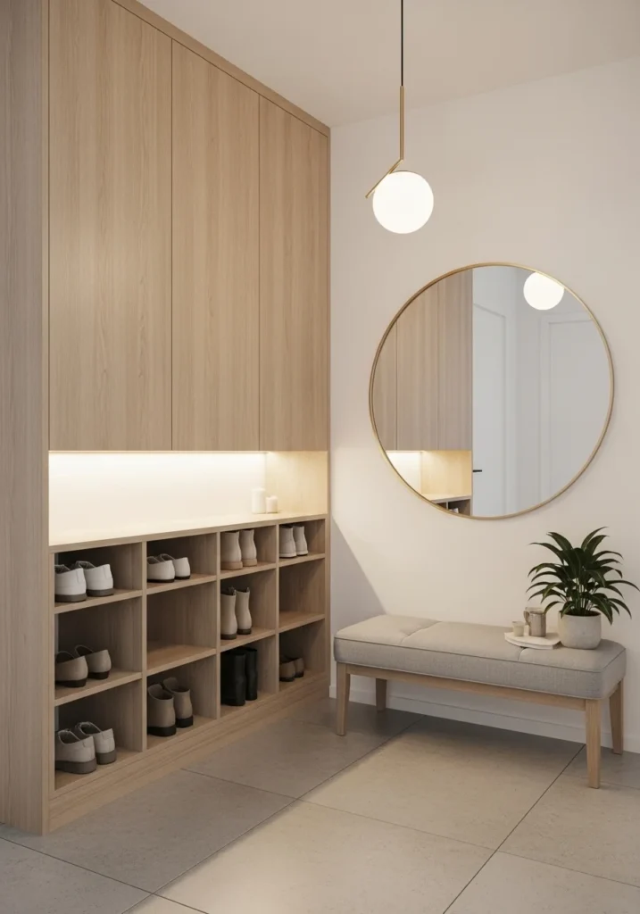 Clean Aesthetic Entryway with Built-In Shoe Rack and Soft Lighting