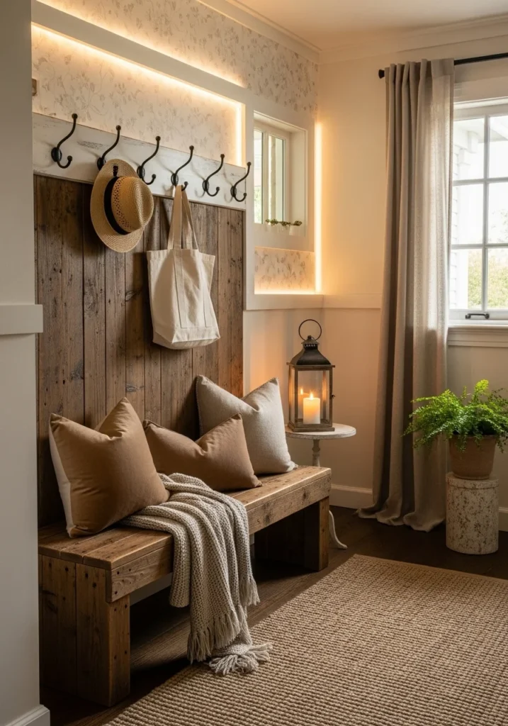 Cozy Cottage-Style Entryway with Rustic Wooden Bench and Soft Lighting