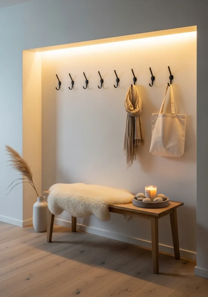 Cozy Minimalist Entryway with Soft Lighting and Wall Hooks