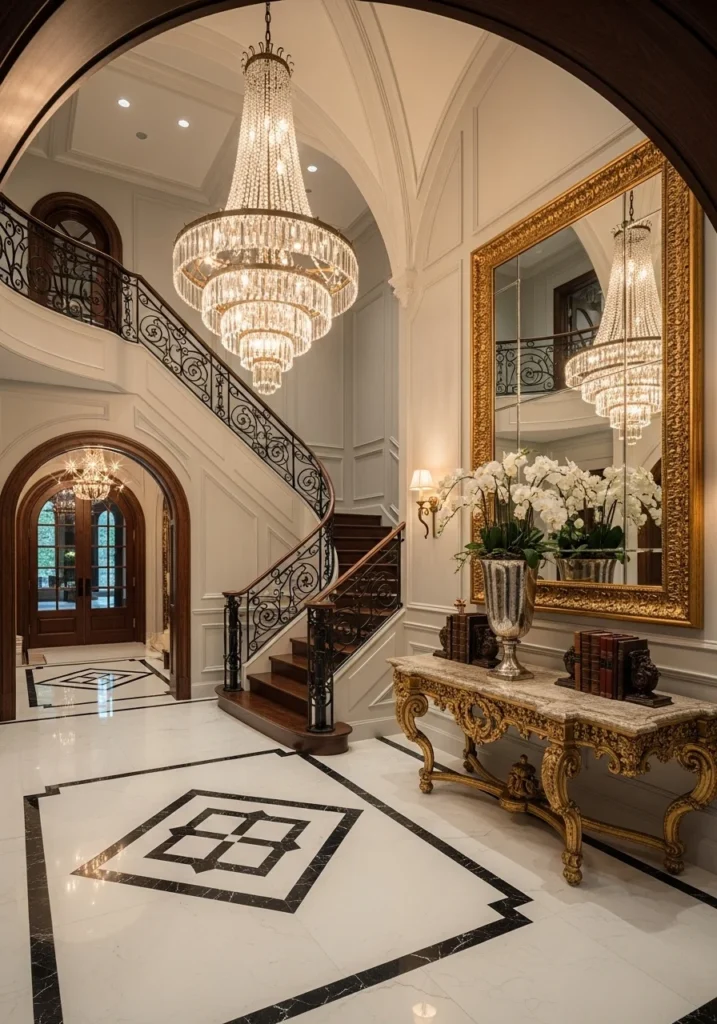To soften the formal ambiance, add natural touches like fresh flowers or plush rugs. This blend of opulence and grace results in an entryway that feels both stately and inviting — the perfect prelude to a beautifully designed home.