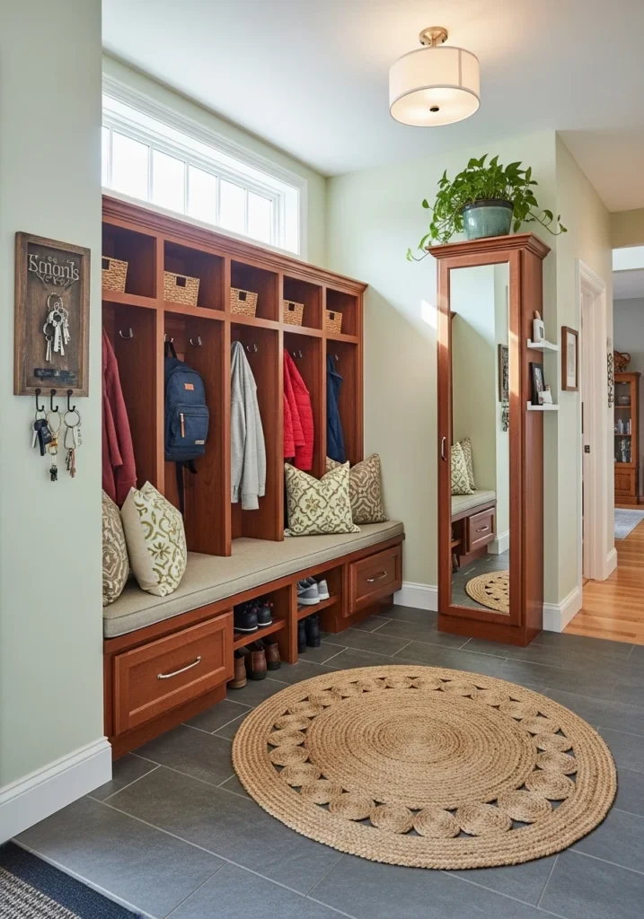 Built-in cabinets, benches with hidden storage, and open shelving ensure everything has its place — from shoes and coats to bags and accessories. Durable materials like wood, tile, and metal make the space easy to maintain while adding a refined touch.