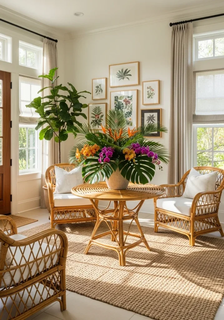 Entryway with Rattan Furniture and Tropical Vibes