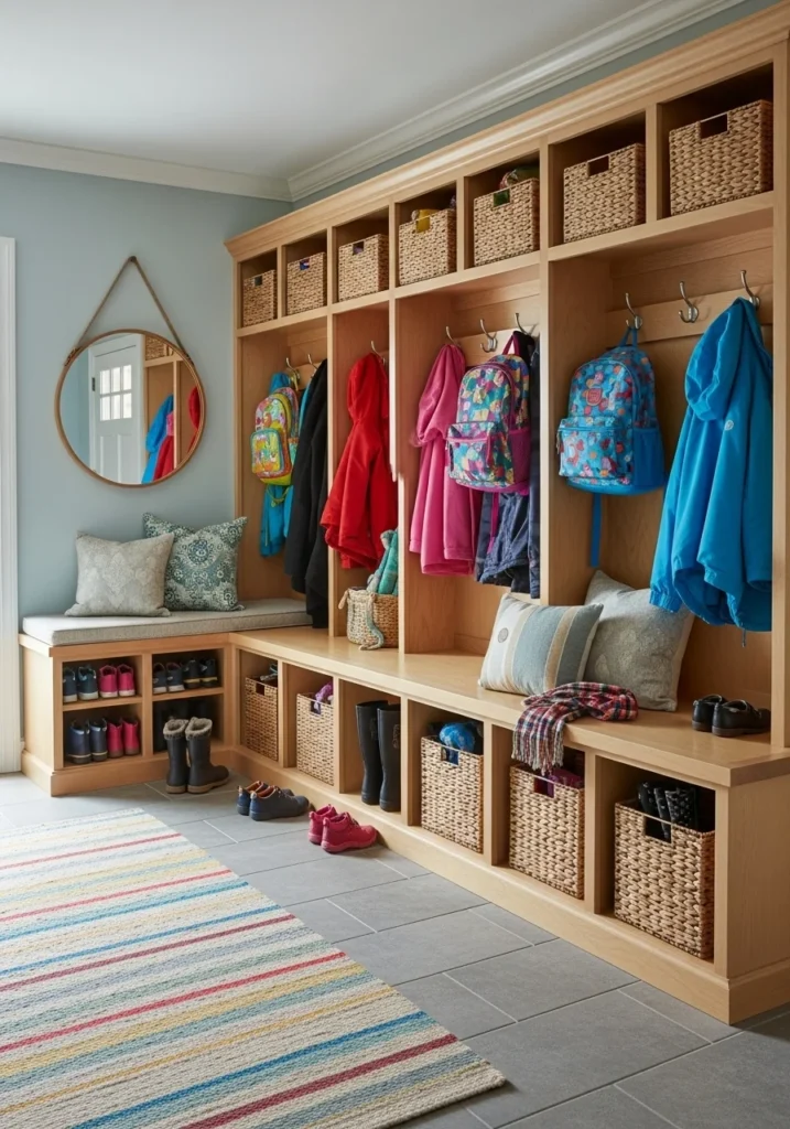 Cubbies, coat hooks, and labeled baskets keep essentials neatly arranged and easy to reach. Durable finishes and washable fabrics withstand everyday wear, while cheerful colors or personal touches — like framed photos or art — make the space inviting.
